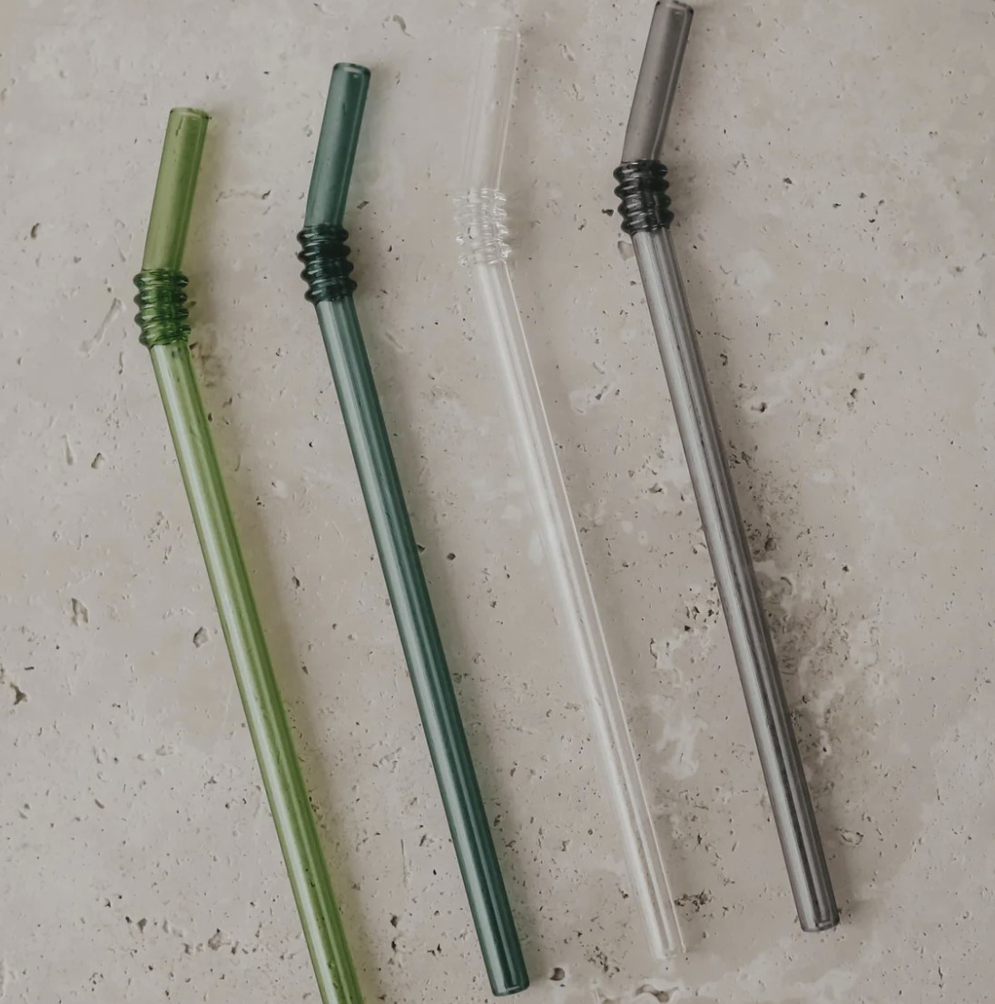 Dieses stilvolle Set umfasst zwei Strohhalme in harmonischen Grüntönen, einen in modernem Anthrazit und einen in klassischem Transparent.