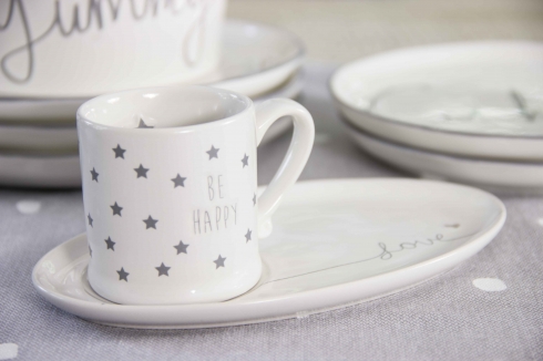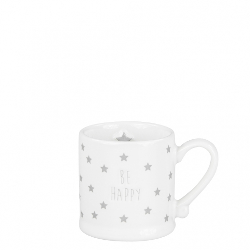 Be happy Schriftzug in grau mit Relief Stern auf der Innenseite der Tasse