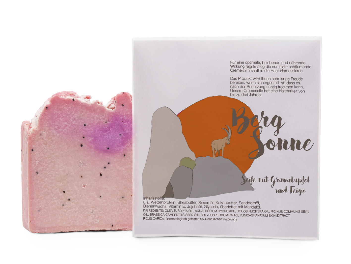 Die wunderschöne *Berg Sonne* nur leicht schäumende Seife hat eine optimale, belebende und nährende Wirkung. Mit Granatapfel & Feige