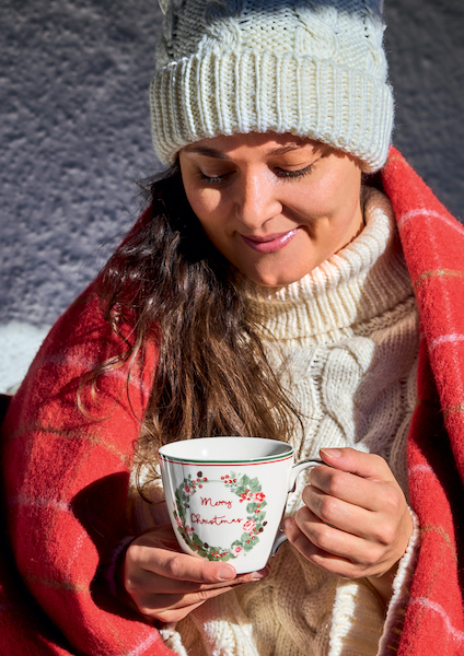 Mit der hübschen Tasse *Merry christmas* in weiß im blumigen Muster