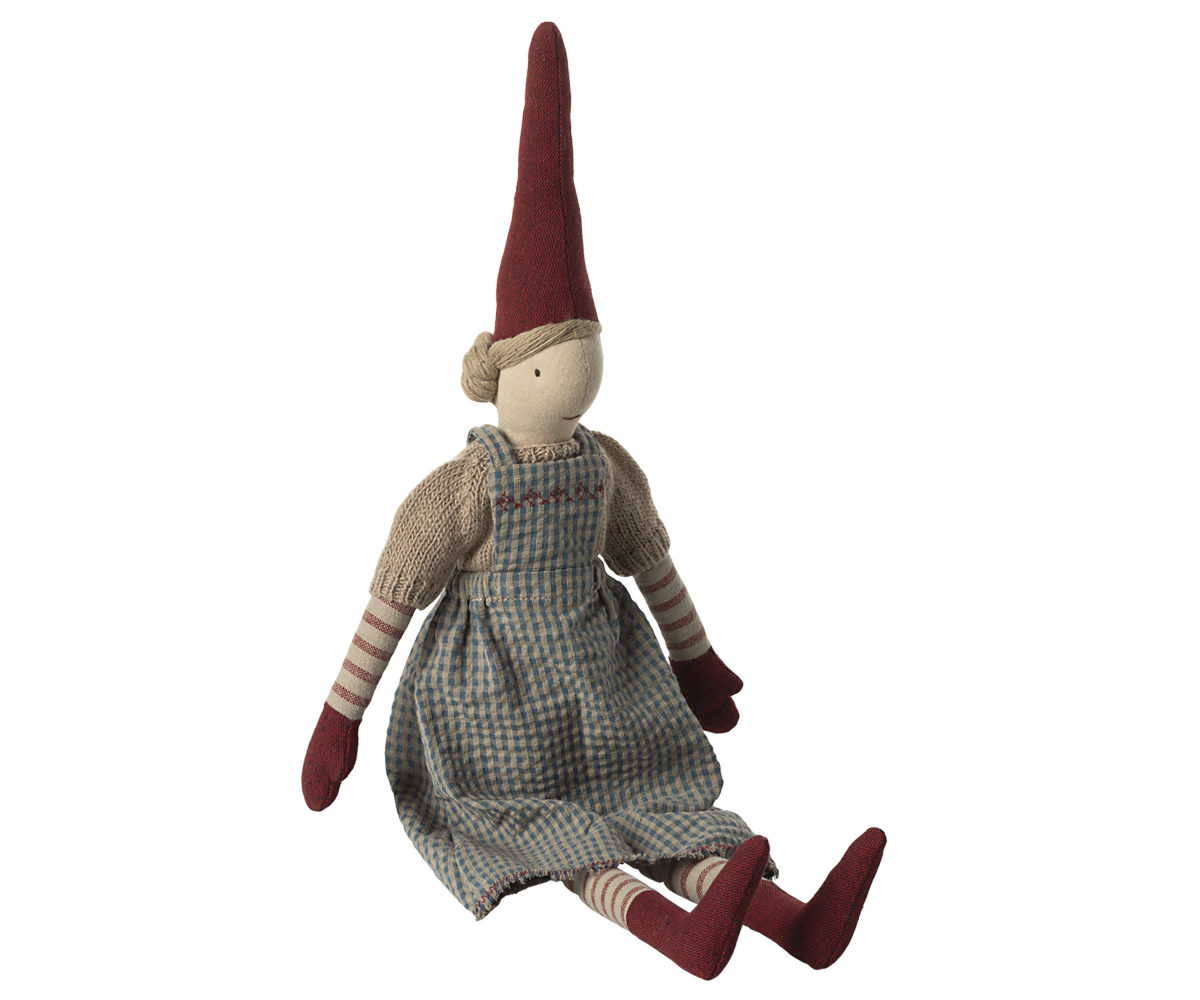 Das süße Weihnachtswichtel Mädchen im blauen Kleid von Maileg wird mit ganz viel Liebe